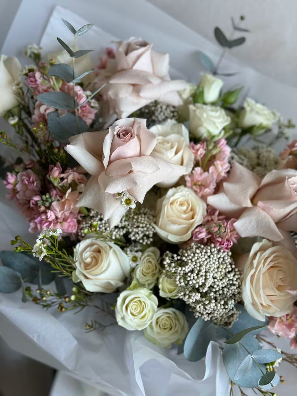 The Charm Bouquet is a delightful handheld arrangement featuring an array of blush-colored flowers. This elegant bouquet exudes romance and grace, making it a perfect choice for any special occasion.