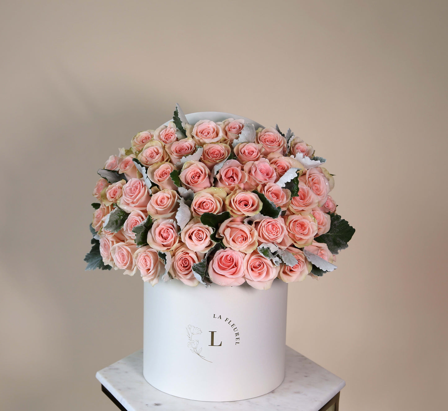This beautiful box contains a combination of 45 to 50 fresh roses in an ivory box. This floral arrangment is the perfect gift for your loved one!