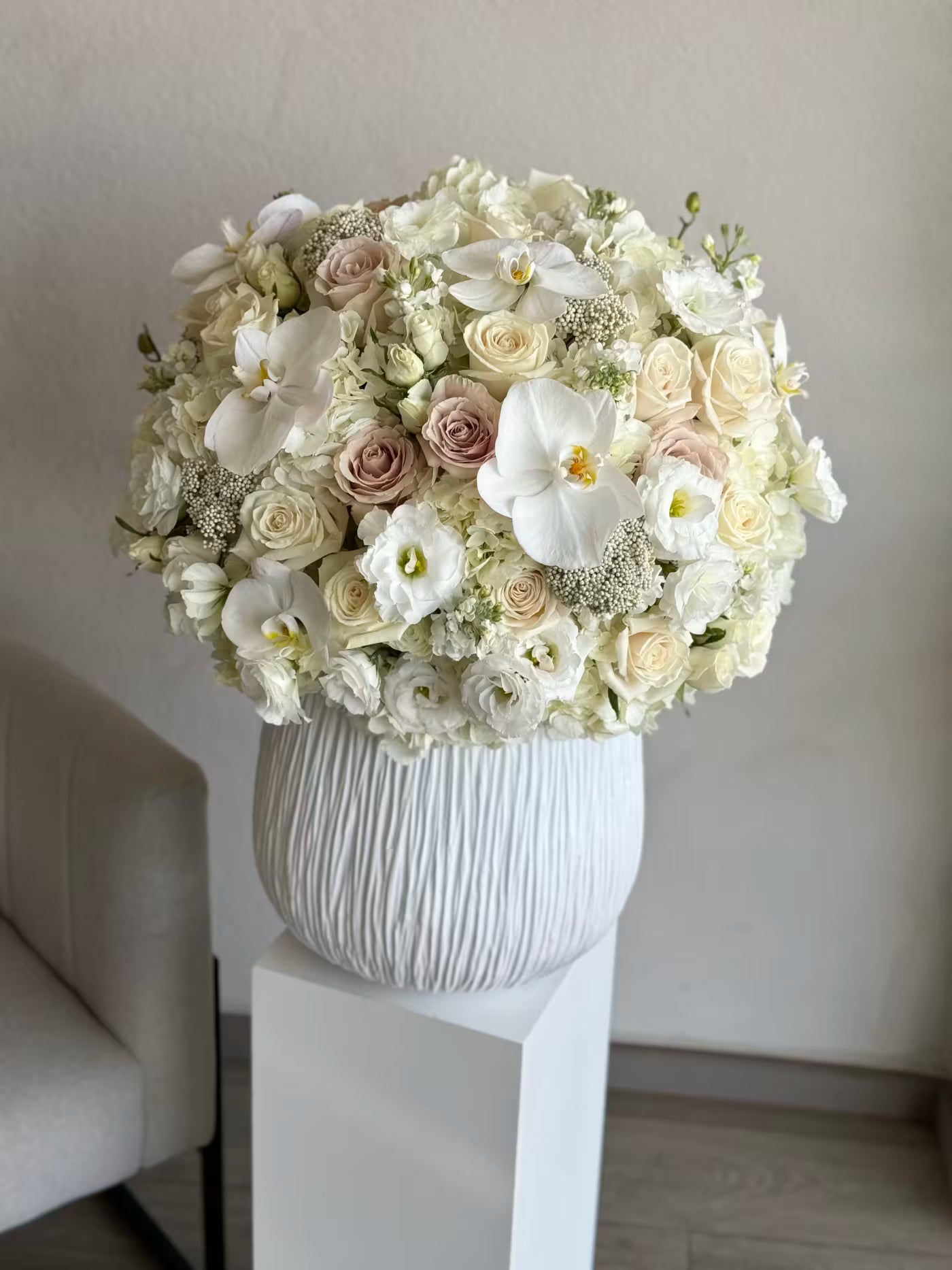 A grand and sophisticated all-white arrangement featuring lush hydrangeas, delicate peonies, velvety roses, airy lisianthus, and fragrant stock. This timeless design exudes grace, luxury, and serenity, making it perfect for any elegant setting.