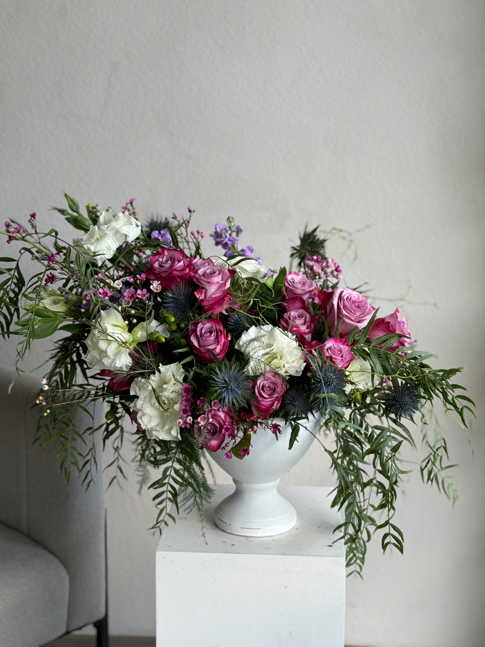 Welcome to our floral sanctuary, where the Violet Twilight Bouquet awaits. This exquisite arrangement features deep purple roses, thistles, and lisianthus. The deep purple roses bring a touch of mystery, thistles add a rugged elegance, and lisianthus contribute a soft, dreamlike quality. Perfect for expressing love or marking a special moment, the Violet Twilight Bouquet is a captivating blend of sophistication and natural beauty. Order now to bring this enchanting floral poetry into your space.