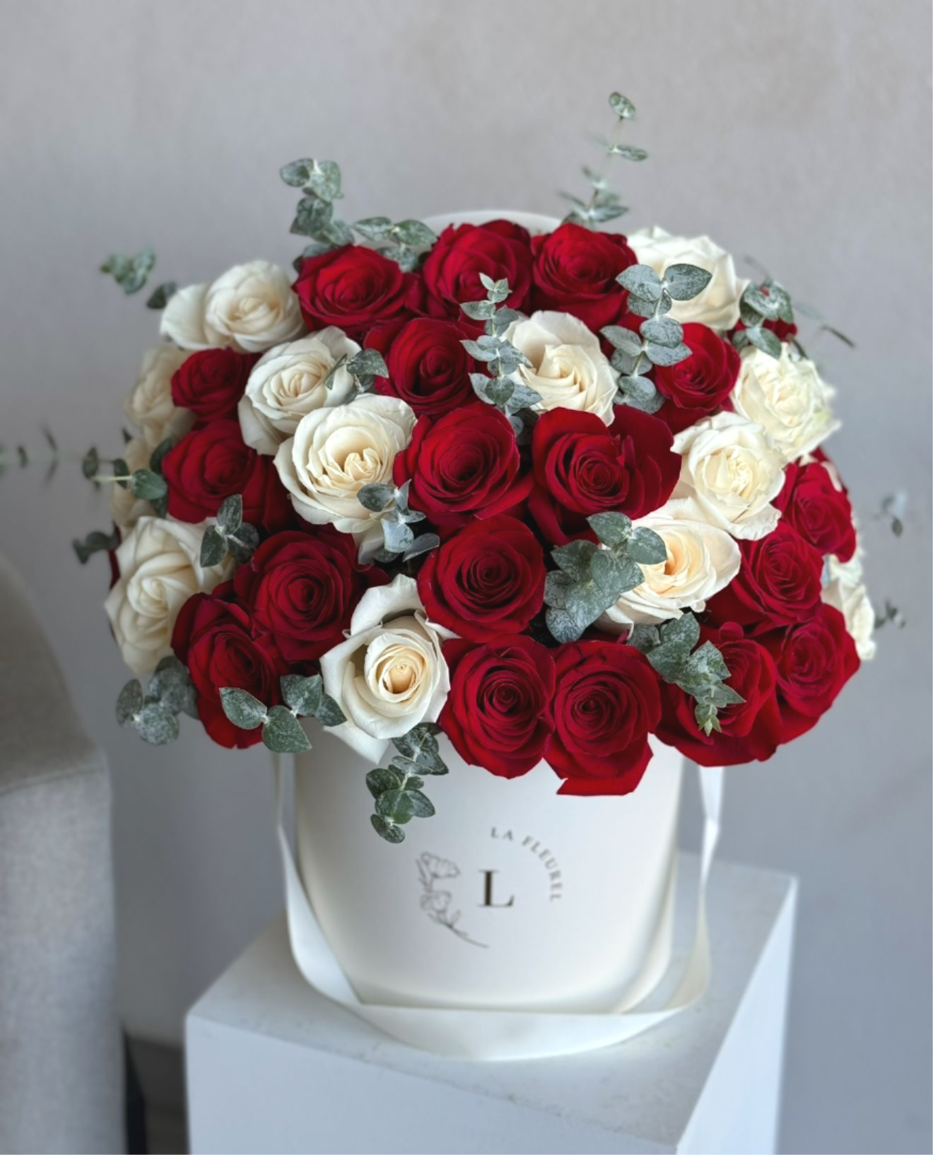 A timeless and elegant arrangement featuring 25 premium red and white roses, thoughtfully designed in our signature white box. Finished with fresh eucalyptus for a soft, airy touch and a luxurious fragrance, this classic color combination creates the perfect romantic statement for Valentine’s Day, anniversaries, or any moment you want to make unforgettable.